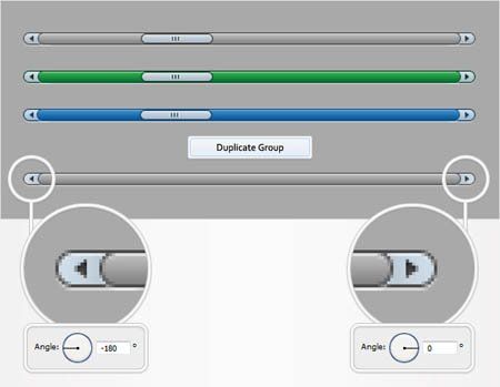 Вернитесь к группе Grey Slider и дублируйте её. Назовите копию Red Slider и перетащите её на несколько пикселей вниз, как показано на скриншоте. Откройте эту группу и удалите фигуру кнопки вместе с тремя, небольшими прямоугольниками. Теперь отредактируем левый и правый прямоугольники с круглыми углами. Откройте окно стилей слоя и измените настройки для опции Угол (Аngle) в параметре Наложение градиента (Gradient Overlay).