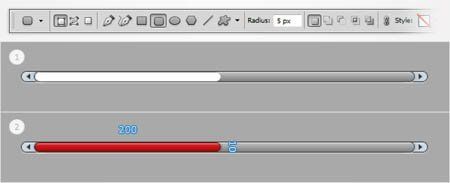 (Rounded Rectangle Tool) и убедитесь, что радиус установлен на 5пикс. Создайте фигуру размером 200х10 пикселей и разместите её, как показано на скриншоте. Откройте окно стилей слоя для этой фигуры и введите настройки для стилей: Тень (Drop Shadow), Внутренняя тень (Inner Shadow), Наложение градиента (Gradient Overlay) и Обводка (Stroke). Настройки смотрите ниже на скриншотах. Затем переместите эту фигуру в группу Red Slider.