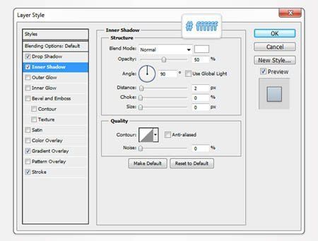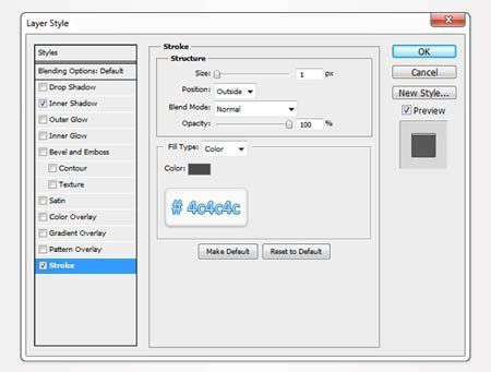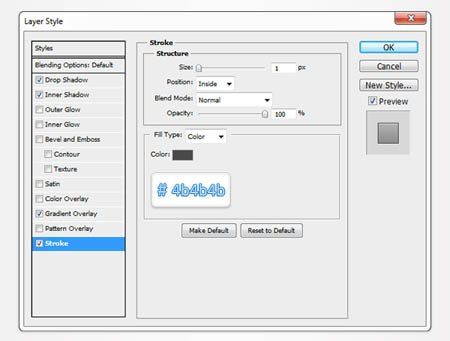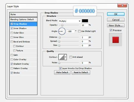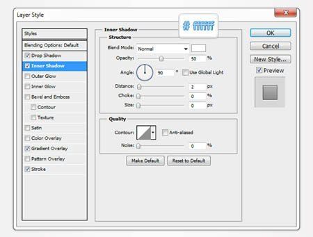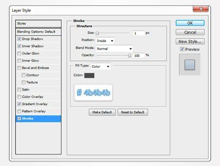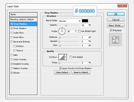 Теперь настроим стили слоя для созданной фигуры в предыдущем шаге. Это будут стилиТень (Drop Shadow), Внутренняя тень (Inner Shadow), Наложение градиента (Gradient Overlay) и Обводка (Stroke). Настройки смотрите ниже на скриншотах.