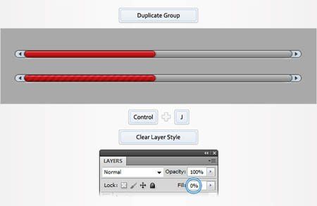 Вернитесь в настройки сетки и снова измените интервалы сетки в 1 пикс. в меню Редактирование – Установки – Направляющие, сетка и фрагменты (Edit > Preferences > Guides, Grid & Slices), как это делали в первом шаге. Дублируйте группу Red Slider и переместите копию на несколько пикселей вниз. Откройте дублированную группу, выберите красный прямоугольник со скругленными углами и скопируйте его Ctrl + J. Стоя на копии, нажмите правой кнопкой мыши и выберите пункт Очистить стиль слоя (Clear Layer Style). Теперь поставьте для этой фигуры Заливку