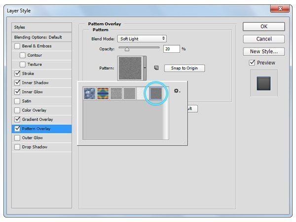 Загрузите набор узоров «Dark Gray Flecks» и примените стиль Наложение узора (Pattern Overlay):