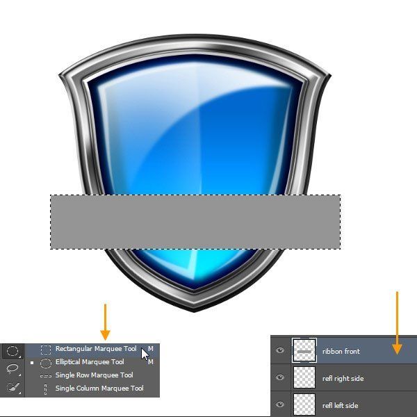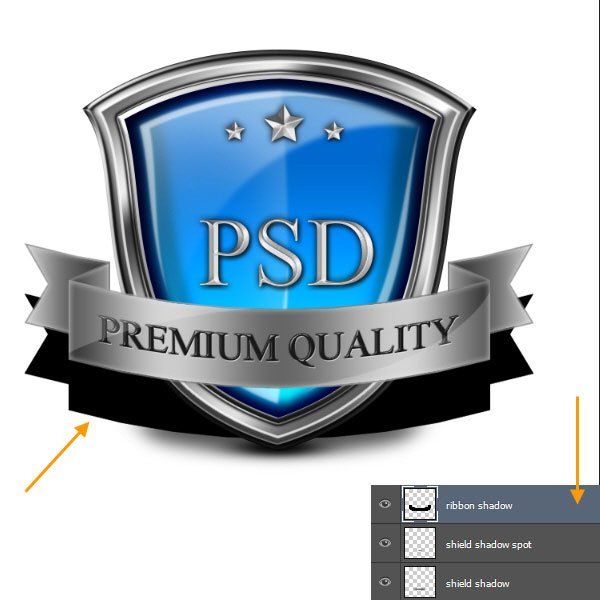 Создайте новый слой над слоем «shield shadow spot» и назовите его «ribbon shadow». Залейте выделение чёрным цветом. Опустите тень под ленту.