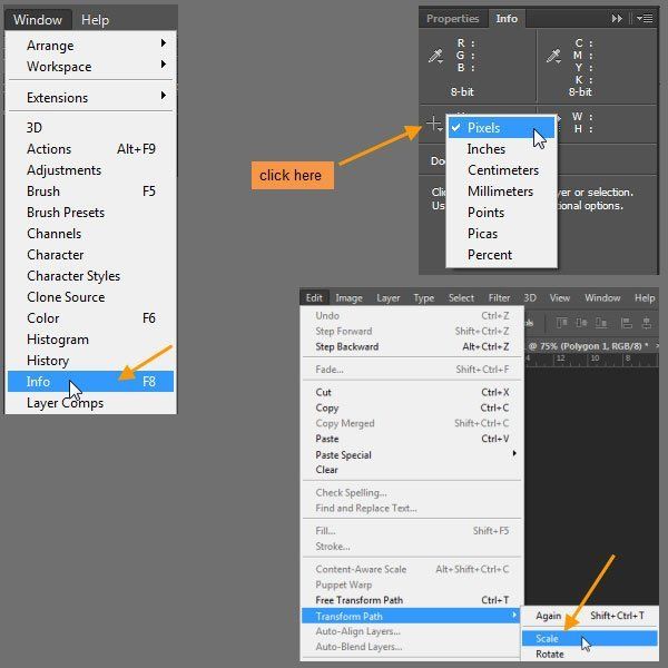 Откройте панель Инфо (Окно > Инфо) (Window > Info). Кликните на иконке плюса (+) и выберите Пиксели (Pixels) как единицу измерения. На панели инструментов выберите слой с треугольником и инструмент Перемещение (Move Tool) (V). После этого перейдите в меню Редактирование > Трансформирование контура > Масштаб (Edit > Transform Path > Scale).