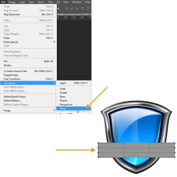 Выделите слой «shield outer» и создайте новый слой «shield shadow» под ним. Залейте выделение чёрным цветом. Активируйте режим Свободное трансформирование (Ctrl + T) и уменьшите высоту, как показано ниже.