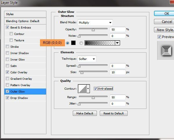 Внешнее свечение (Outer Glow): Режим – Умножение, Метод – Мягкий.
