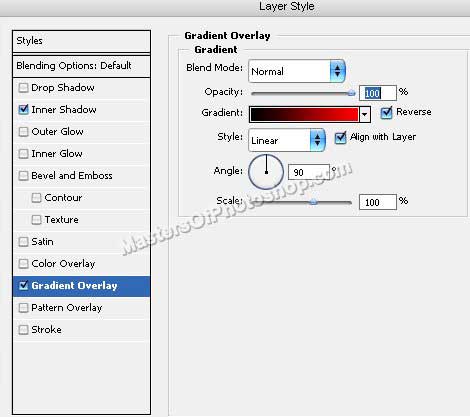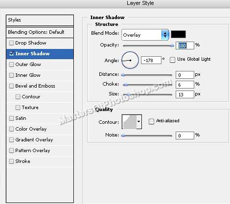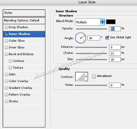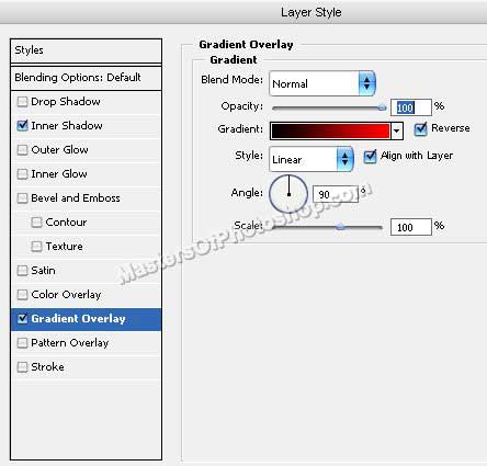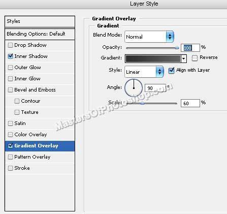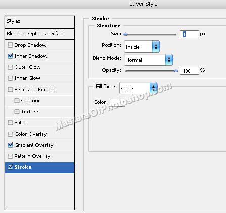 Щелкните дважды на слое с прямоугольником, чтобы открыть палитру стилей. Примените следующие стили: