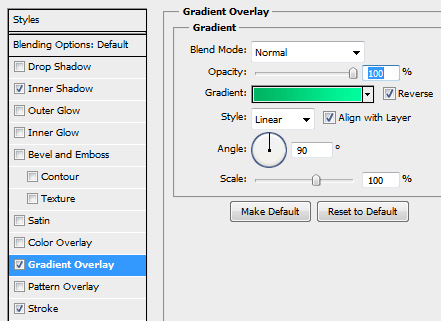 Теперь применим Наложение градиента (Gradient overlay) с параметрами, как на скриншоте ниже. Градиент от #03ff9d к #06b561.