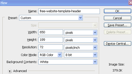 Прежде всего, откройте новый документ заказного размера с шириной и высотой (Width & Height) 650 на 199 пикселей соответственно, разрешением (Resolution) 72 пикселя и цветовым режимом RGB (Mode RGB Color).
