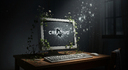 A dramatic digital painting depicting the "death" of a website. An abandoned, empty computer monitor sits on a desk in a dark room. The monitor's screen is cracked, and delicate wildflowers and ivy are growing through the cracks. The website name "Creativo" is barely visible, fading from the screen. A dusty keyboard lies on the desk. Glowing particles of data are slowly rising from the monitor like a soul leaving the body. Style: cinematic lighting, deep shadows, in the style of digital baroque.